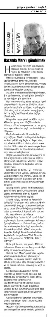 Bu yazdıklarımı 1970’lerde söylediğimizde “vatan haini komünistler” suçlamasıyla başımıza gelmeyen kalmazdı. Oysa şimdilerde on binlerce insan, haftalarca süren eylemlerle haykırıyor bunları. Hem de kapitalimin kâbesi olan yerde. Amerika Birleşik Devletlerindeki dünya kapitalimin simgesi olan Wall Street’te. Temel sloganları ise “KAPİTALİZME HAYIR”