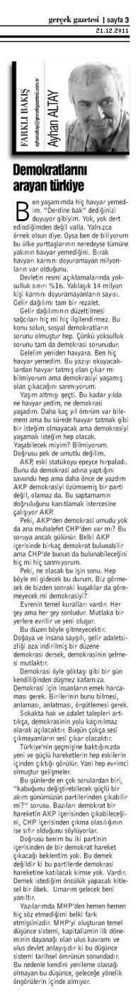 Doğrusu benim bu iki partinin içerisinden de bir demokrat hareket çıkacağı beklentim yok. Bu demek değildir ki bu partilerde demokrasi hareketine katılacak kimse yok. Vardır. Demek istediğim öncülük yapacak kitlesel bir öbek. Umarım gelecek beni yanıltır.