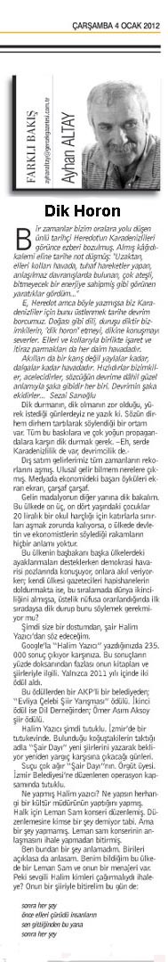 Dik durmanın, dik olmanın zor olduğu, yürek istediği günlerdeyiz ne yazık ki. Sözün dirhem dirhem tartılarak söylendiği bir ortam var. Tüm bu baskılara ve çok yoğun propagandalara karşın dik durmak gerek. –Eh, serde Karadenizlilik de var, devrimcilik de.-