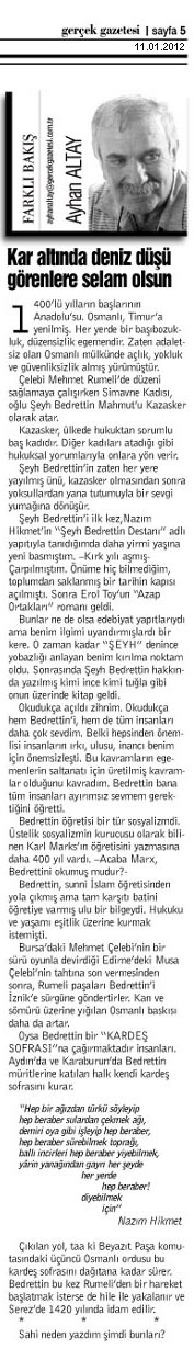 Şeyh Bedrettin’i ilk kez Nazım Hikmet’in “Şeyh Bedrettin Destanı” adlı yapıtıyla tanıdığımda daha yirmi yaşına yeni basmıştım. –Kırk yılı aşmış- Çarpılmıştım. Önüme hiç bilmediğim, toplumdan saklanmış bir tarihin kapısı açılmıştı. Sonra Erol Toy’un “Azap Ortakları” romanı geldi.