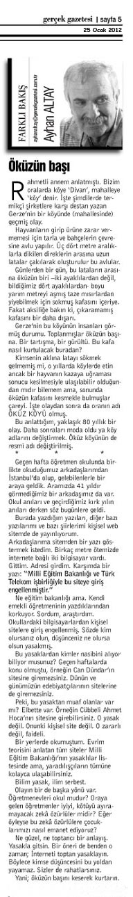 Burada yazdığım yazıları, diğer bazı yazılarımı ve bazı şiirlerimi kişisel web sitemde de yayınlıyorum. Arkadaşlarıma sitemden bir yazı göstermek istedim. Birkaç metre ötemizde internete bağlı iki bilgisayar vardı. Gittim. Adresi girdim. Karşımda bir yazı: “Milli Eğitim Bakanlığı ve Türk Telekom işbirliğiyle bu siteye giriş engellenmiştir.”