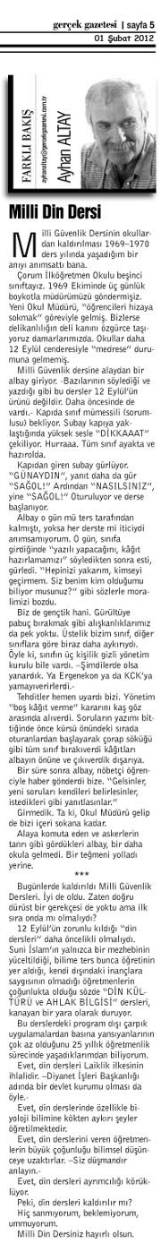 12 Eylül’ün zorunlu kıldığı “din dersleri” daha öncelikli olmalıydı. Suni İslam’ın yalnızca bir mezhebinin yüceltildiği, bilime ters bunca öğretinin yer aldığı, kendi dışındaki inançlara saygısının olmadığı öğretmenlerin çoğunlukta olduğu sözde “DİN KÜLTÜRÜ ve AHLAK BİLGİSİ” dersleri kanayan bir yara olarak duruyor.