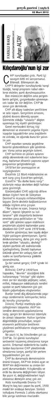CHP bu durumuyla demokrasinin önünü tıkayan, AKP’nin önünü açan ve MHP’nin değirmenine su akıtan bir parti durumundadır. Kılıçdaroğlu ve ekibi bu durumu değiştirmek istiyor. Ne yazık ki, değiştirebilmeleri haydi olanaksız demeyim ama çok zor.