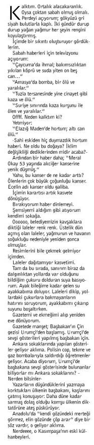 Ankara sokaklarında yapılan gösteriler geliyor aklıma. Polisin cop, tekme ve gaz bombalarıyla saldırdığı öğretmenler geliyor. Acaba diyorum, Urumçi’de başbakana sevgi gösterisinde bulunanlar biliyorlar mı Ankara sokaklarını? -Nerden bilsinler-