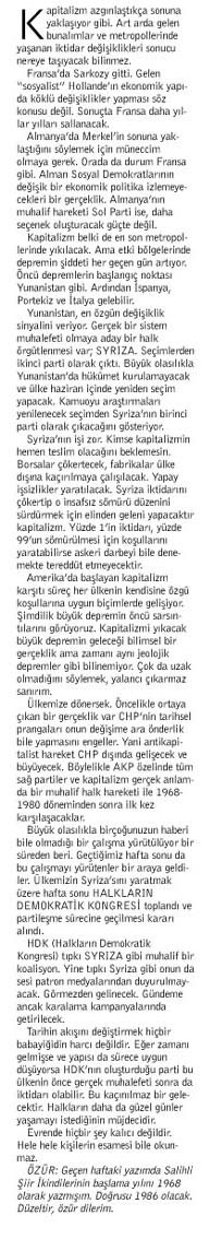Yunanistan, en özgün değişiklik sinyalini veriyor. Gerçek bir sistem muhalefeti olmaya aday bir halk örgütlenmesi var; SYRIZA. Seçimlerden ikinci parti olarak çıktı. Büyük olasılıkla Yunanistan’da hükümet kurulamayacak ve ülke haziran içinde yeniden seçim yapacak. Kamuoyu araştırmaları yenilenecek seçimden Syriza’nın birinci parti olarak çıkacağını gösteriyor.