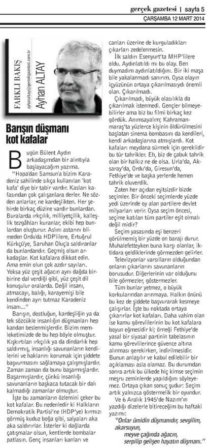 Çıkarılmadı, büyük olasılıkla da çıkarılmak istenmedi. Gençler bilmeyebilirler ama biz bu filmi birkaç kez gördük. Anımsayalım; Kahramanmaraş’ta yüzlerce kişinin öldürülmesini başlatan sinema bombasını da kendileri, kendi arkadaşlarına atmışlardı. Kot kafaları meydana sürmek için gereklidir bu tür tahrikler. Eh, biz de çabuk tahrik olan bir halkız ne de olsa. Urla’da, Aksaray’da, Ordu’da, Giresun’da, Fethiye’de ve başka yerlerde hemen tahrik oluverdik.