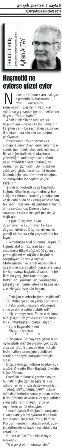 Başbakanın tek ve seçeneksiz olduğuna inanmayan, onun engin sosyoloji, tıp, hukuk, ekonomi, mühendislik ve diğer dallardaki ulaşılmaz yüksekliğini anlamayanların tümü gayri millilikten vatan hainliğine uzanan bir çizgidedir. Bu muazzam zekâ ve ölçüsüz beceri sahibi insanın, ülkemiz için nasıl bir nimet olduğunu anlamayanlar ise sapkın ve geri zekâlıdır.