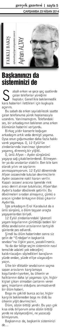 Şimdi bu ölüm haberinden sonra siz gelin de “Erdoğan’ın başkanlık sevdası”na ilişkin yazın, yazabilirseniz.