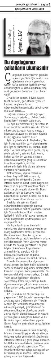 Çarşamba günü yazımın çıkması için en geç Salı öğle saatlerinde göndermiş olmam gerekiyor. Geçen hafta edebiyat içerikli bir yazı göndermiştim ki, daha aradan birkaç saat geçmeden Soma’dan o acı haber geldi.