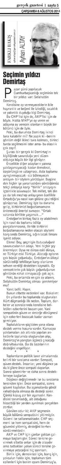 Öncelikle diğer adayların yanına yaklaşamayacağı kadar demokrat, özgürlükçü ve uzlaşmacı. Asla toplumu ayrıştırmayacak –siz bölmeyecek anlayın- bir söylem yürütüyor. Bugüne dek hiçbir işe yaramadığını gördüğümüz tekçi anlayışa karşı “birlik” anlayışını içtenlikle savunuyor. Tek millet, tek din ya da tek mezhep anlayışının özellikle Ortadoğu’yu nasıl kan gölüne çevirdiğini görüyoruz. Demirtaş; işte bu duruma gelip, birbirimizi boğazlamamızın önleneceği öneriyi sunuyor. “Ortak vatanda birlikte yaşamak…”