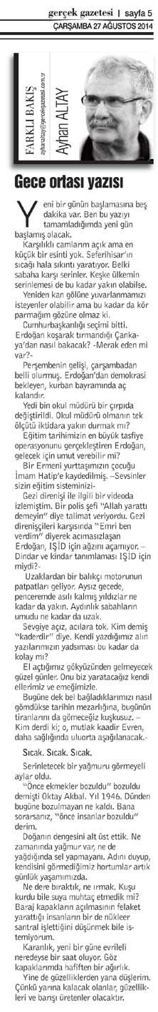 Karşılıklı camlarım açık ama en küçük bir esinti yok. Seferihisar’ın sıcağı hala sıkıntı yaratıyor. Belki sabaha karşı serinler. Keşke ülkemin serinlemesi de bu kadar yakın olabilse.