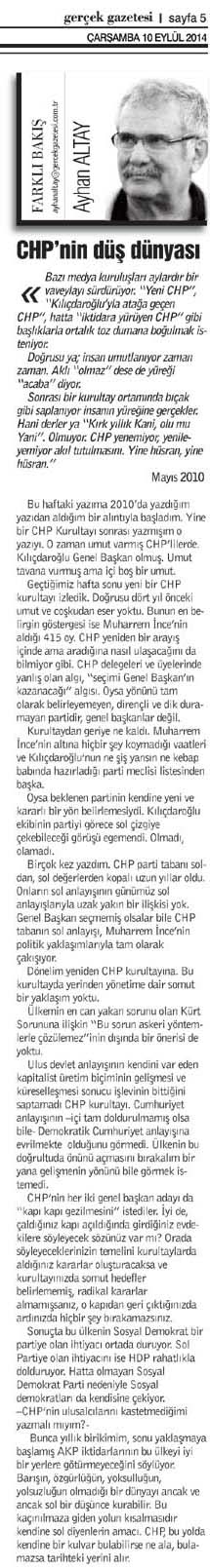 Sonrası bir kurultay ortamında bıçak gibi saplanıyor insanın yüreğine gerçekler. Hani derler ya “Kırk yıllık Kani, olu mu Yani”. Olmuyor. CHP yenemiyor, yenileyemiyor akıl tutulmasını. Yine hüsran, yine hüsran.” Mayıs 2010