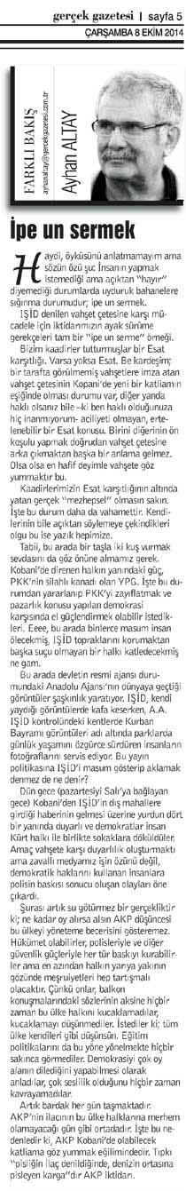 Tabii, bu arada bir taşla iki kuş vurmak sevdasını da göz önüne almamız gerek. Kobani’de direnen halkın yanındaki güç, PKK’nin silahlı kanadı olan YPG. İşte bu durumdan yararlanıp PKK’yi zayıflatmak ve pazarlık konusu yapılan demokrasi karşısında el güçlendirmek olabilir istedikleri. Eeee, bu arada binlerce masum insan ölecekmiş, IŞİD topraklarını korumaktan başka suçu olmayan bir halkı katledecekmiş ne gam.