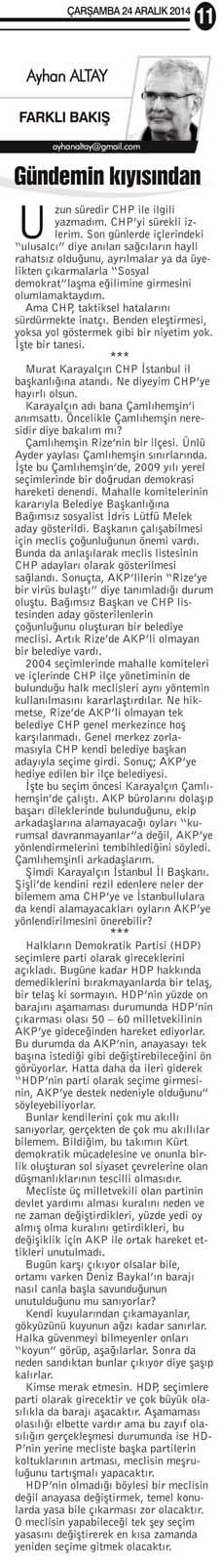 Şimdi Karayalçın İstanbul İl Başkanı. Şişli’de kendini rezil edenlere neler der bilemem ama CHP’ye ve İstanbullulara da kendi alamayacakları oyların AKP’ye yönlendirilmesini önerebilir?