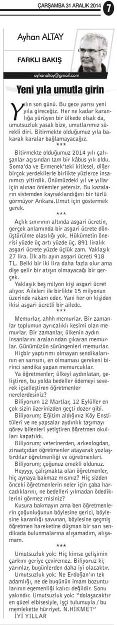 Bitirmekte olduğumuz 2014 yılı çalışanlar açısından tam bir kâbus yılı oldu. Soma’da ve Ermenek’teki kitlesel, diğer birçok yerdekilerle birlikte yüzlerce insanımızı yitirdik. Önümüzdeki yıl ve yıllar için alınan önlemler yetersiz. Bu kazaların sistemden kaynaklandığını bir türlü görmüyor Ankara. Umut için göstermek gerek.