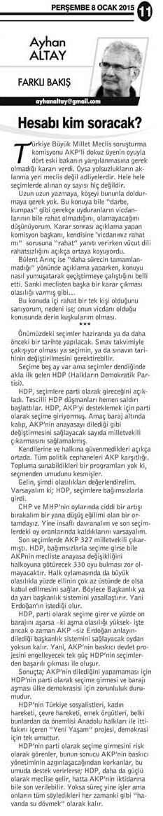 Sonuçta; AKP’nin dilediğini yapamaması için HDP’nin parti olarak seçime girmesi ve barajı aşması ülke demokrasisi için zorunluluk durumudur.