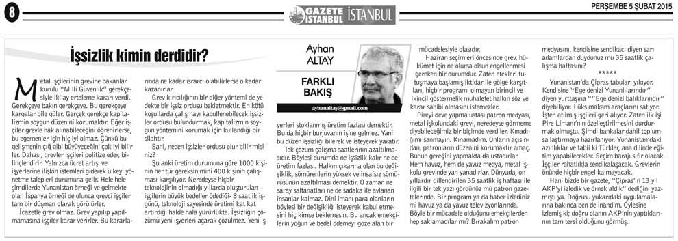 Pireyi deve yapma ustası patron medyası, metal işkolundaki grevi, neredeyse görmeme diyebileceğimiz bir biçimde verdiler. Kınadığımı sanmayın. Kınamadım. Onların açısından, patronların düzenini korumaktır amaç. Bunun gereğini yapmakta da ustadırlar. Hem havuz, hem de yavuz medya, metal işkolu grevinde yan yanadırlar. Dünyada, on yıllardır dillendirilen 35 saatlik iş haftası ile ilgili bir tek yazı gördünüz mü patron gazetelerinde. Bir program ya da haber izlediniz mi havuz ya da yavuz televizyonlarında. Böyle bir mücadele olduğunu emekçilerden hep saklamadılar mı? Bırakalım patron medyasını, kendisine sendikacı diyen sarı adamlardan duydunuz mu 35 saatlik çalışma haftasını?