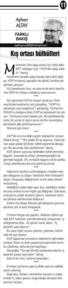 AKP’de ara sıra doğru şeyler söyleyenler çıkıyor. Bülent Arınç; ““Biz yüzde 50 oy alıyoruz. Fakat geriye kalan yüzde 50’de bir nefret söylemine dönüşüyor. Bu durumda ülke yönetilemez” demiş.