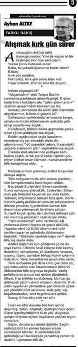 “Yeni demokrasi” adını verdikleri AB zorlaması sürecin boyası da çabuk döküldü. Hapishaneleri 12 Eylül dönemindeki gibi yeniden yazar ve aydınlarla doldurmaya başladık. “Gözünün üzerinde kaşın var” demek bile suç sayılır oldu.